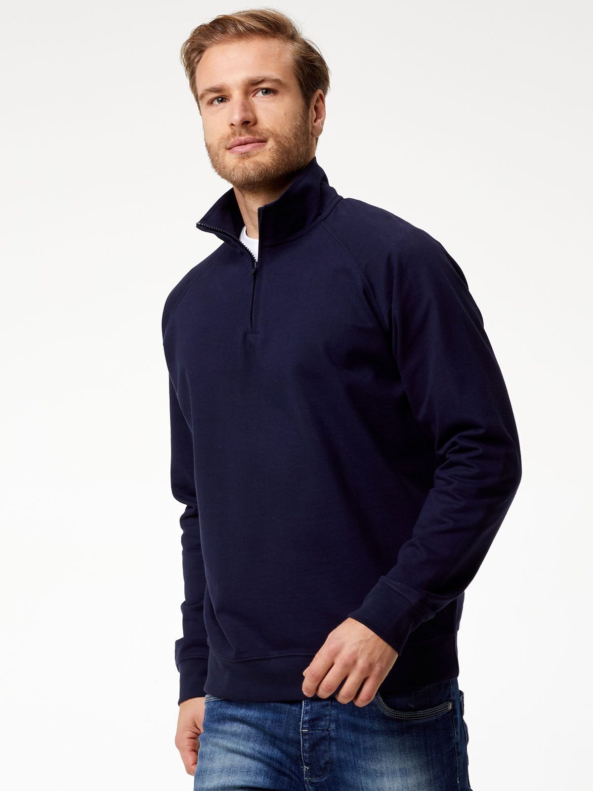 80% cotone 20% poliestere. Felpa french terry con mezza zip, maniche raglan, collo alto. Orlo inferiore e polsini in costina, struttura con cuciture laterali. Etichetta strappabile. Parte esterna: 100% cotone, parte interna: 50% cotone, 50% poliestere.