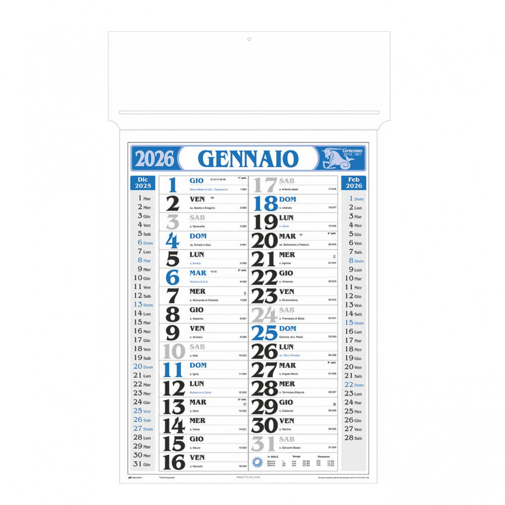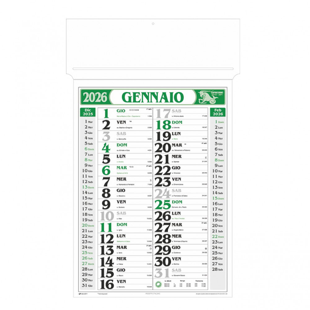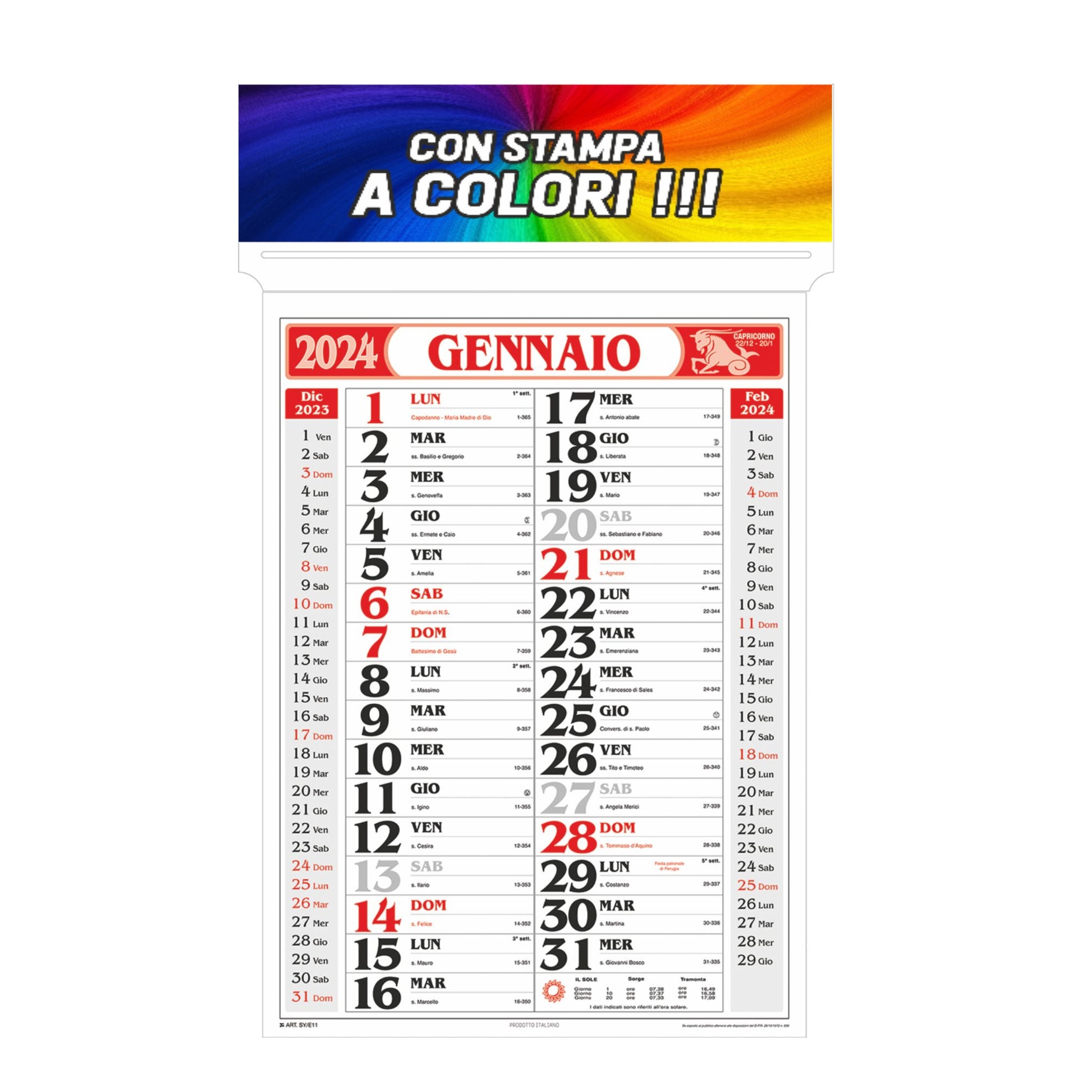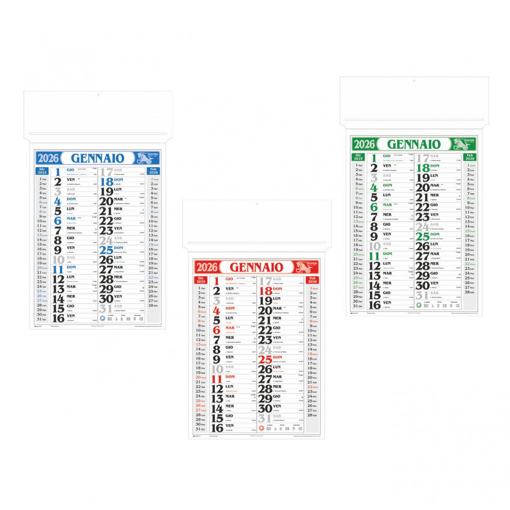 Calendario olandese passafoglio. Trimestrale 12 fogli. Colori: rosso, blu, verde. Dimensioni: cm 34x55, testata rinforzata cm 34x9.5. Imballo: 100xcolore