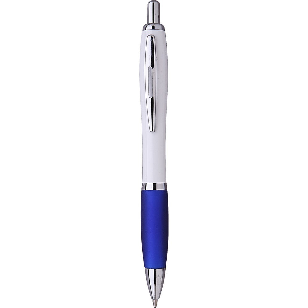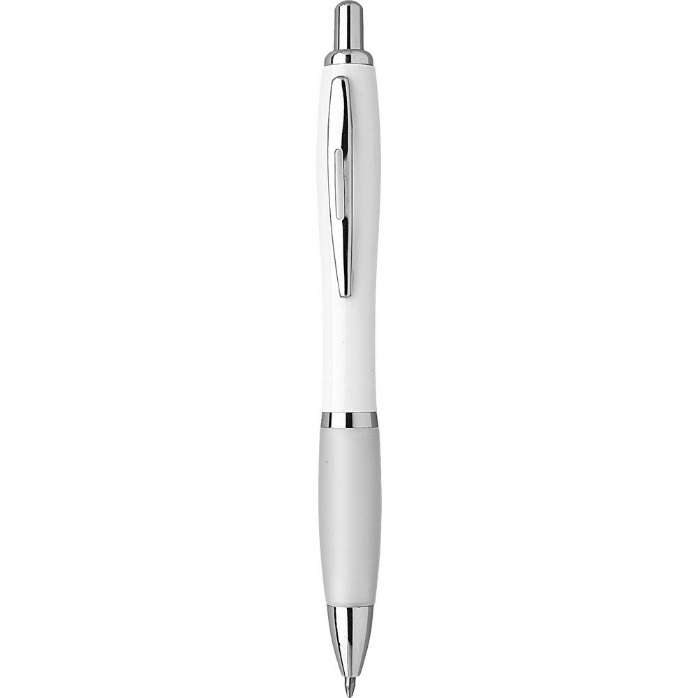 Penna sfera a scatto in plastica con clip in metallo. Fusto bianco impugnatura colorata e parti-colari silver. Refill nero.