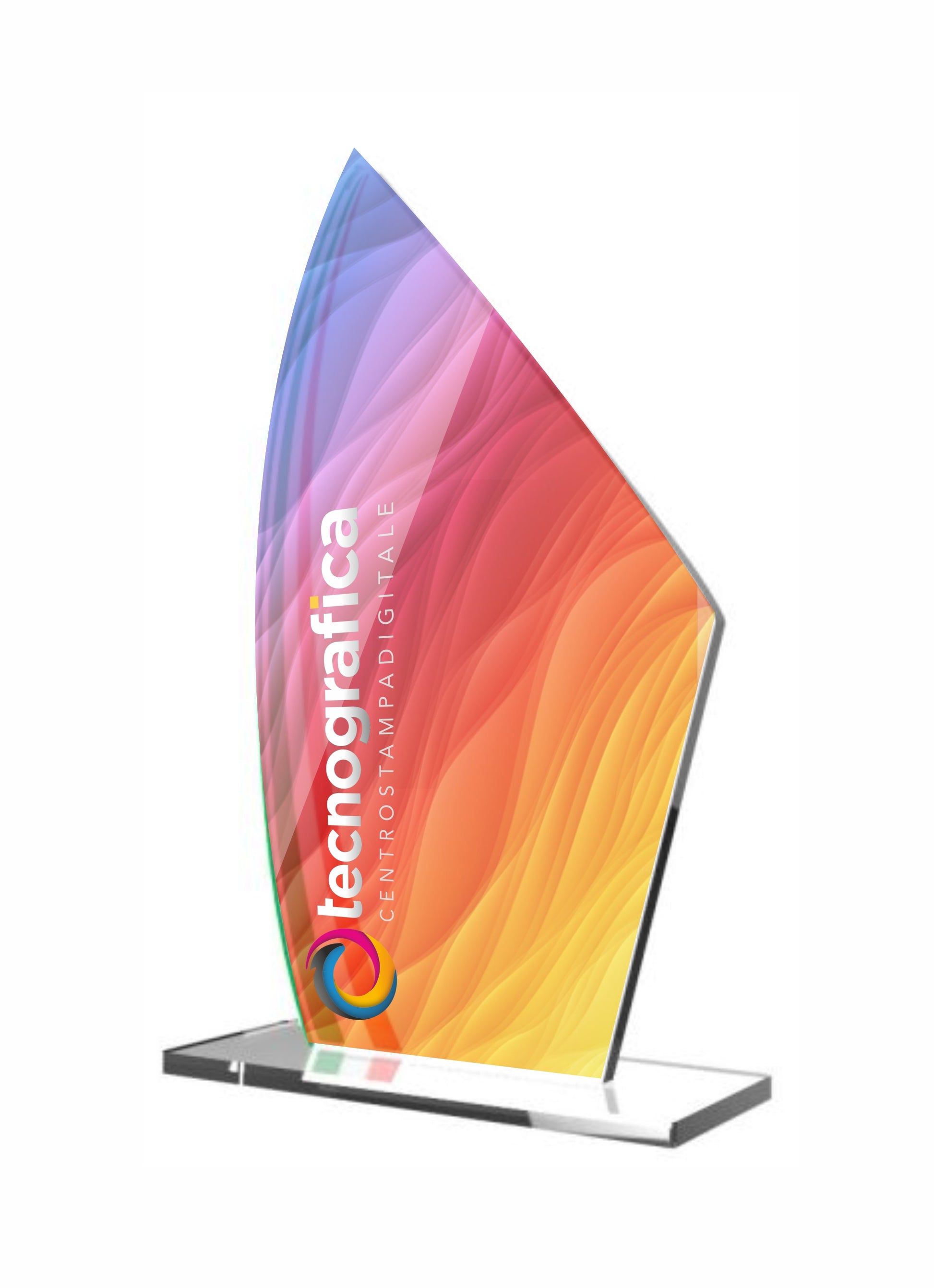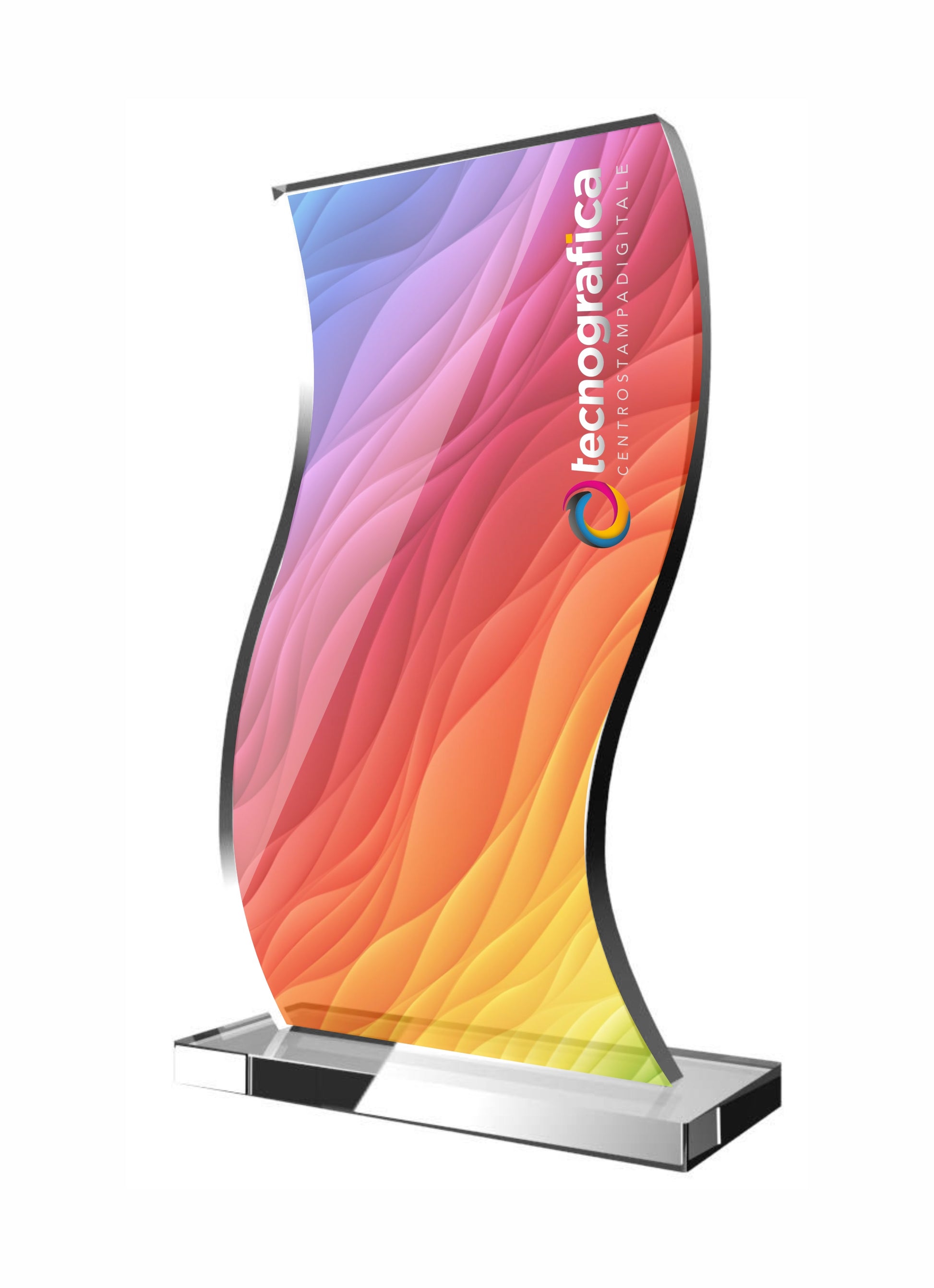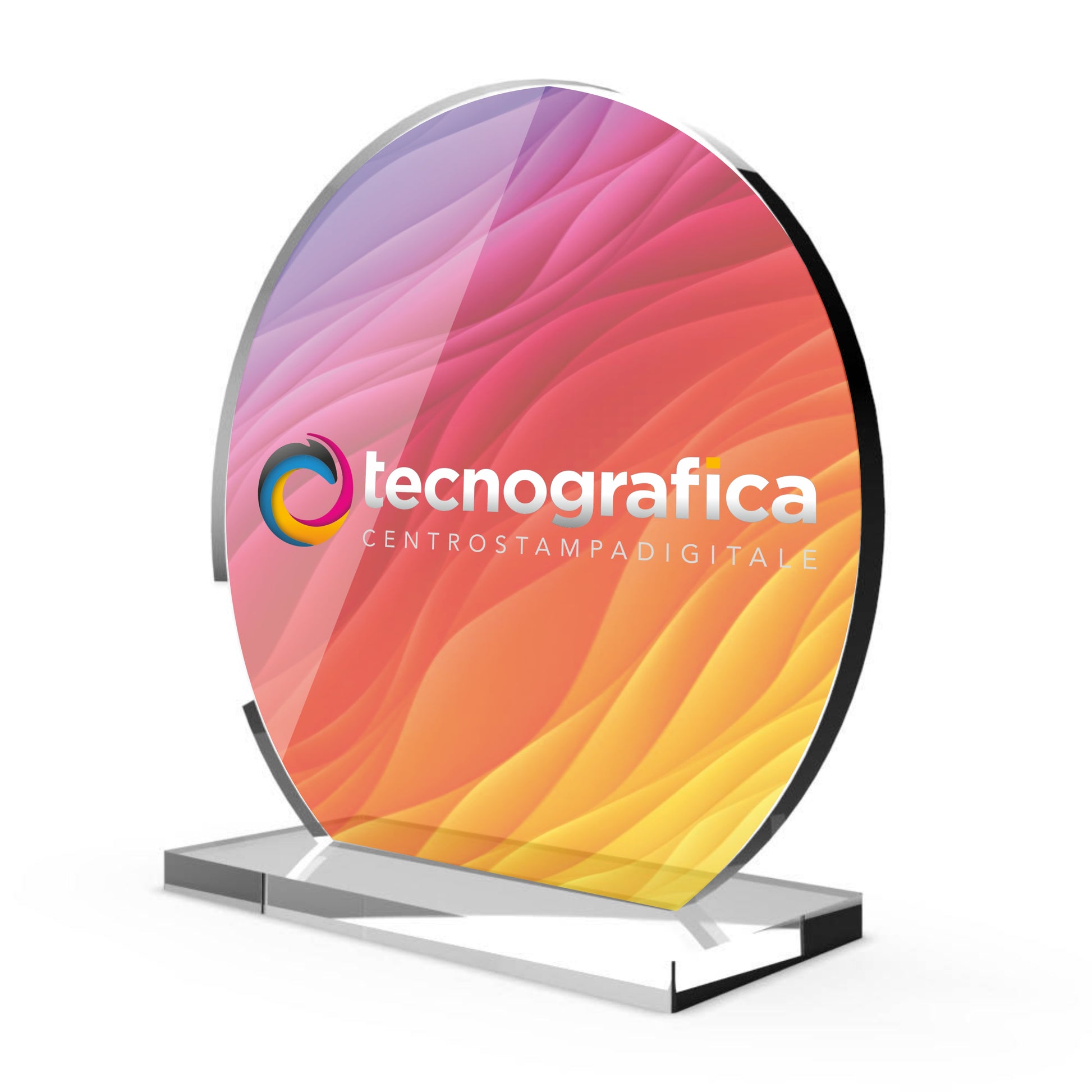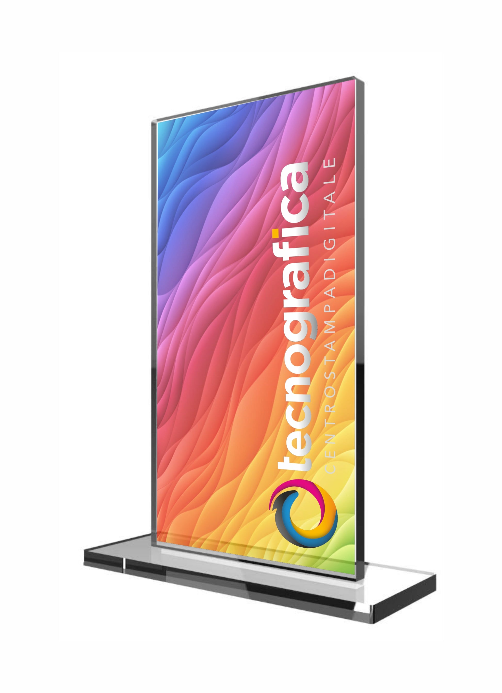 Targa in plexiglass economica con base ad incastro, personalizzata con stampa digitale in quadricromia